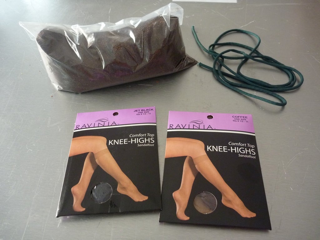 Stretch the stocking around the cup with the hole cut in the bottom of it and pour coffee grounds in.